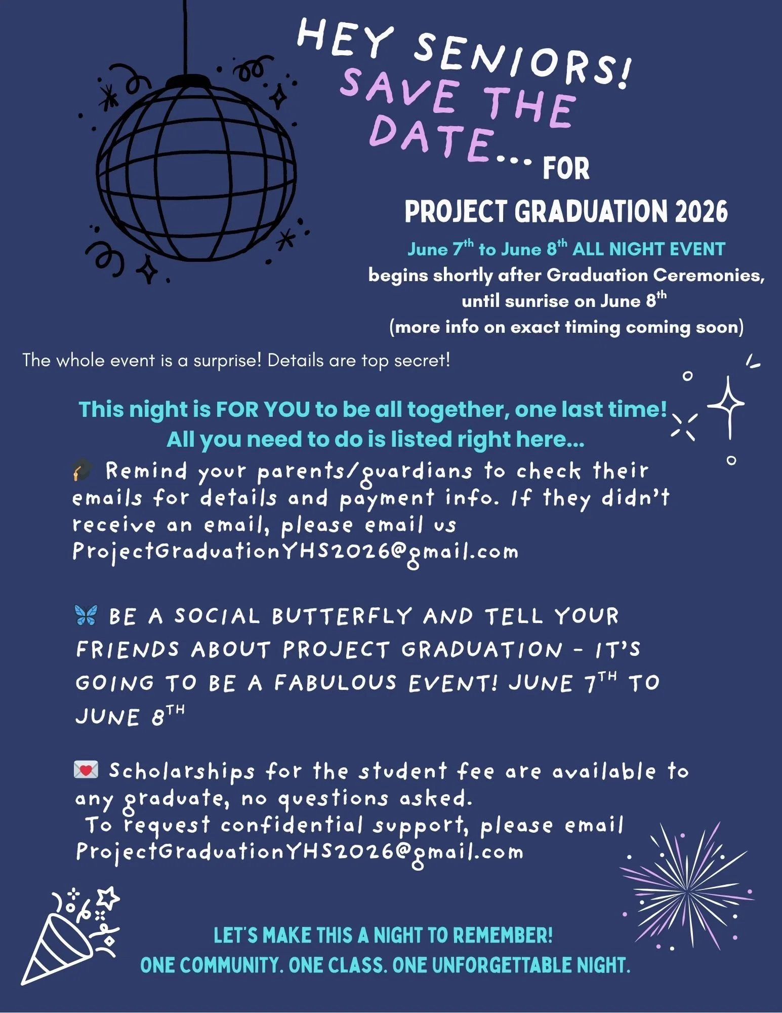 It’s not too late to register your student for Project Graduation 2026. Please see the attached flyer (originally emailed in mid-November) and reach out to us with any questions. And please let us know if you haven’t received our emails. We want to make sure everyone has the details!